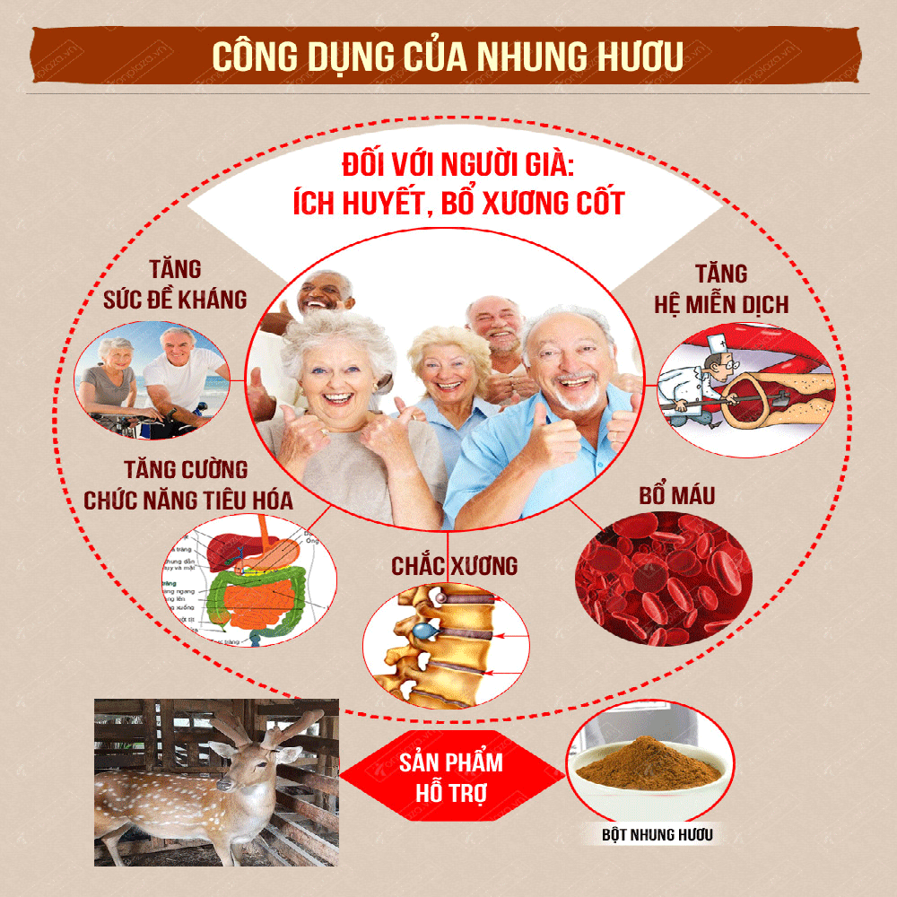 Nhung hươu dùng cho đối tượng nào? Người già dùng nhung hươu có tác dụng gì? Nghiên cứu y khoa chi biết tác dụng của nhung hươu với người cao tuổi lá rất nhiều. Nhung hươu giúp bổ máu, bôi trơn xương khớp, an thần, ngủ ngon, ăn ngon, giảm tình trạng loãng xương, tăng cường trí não.