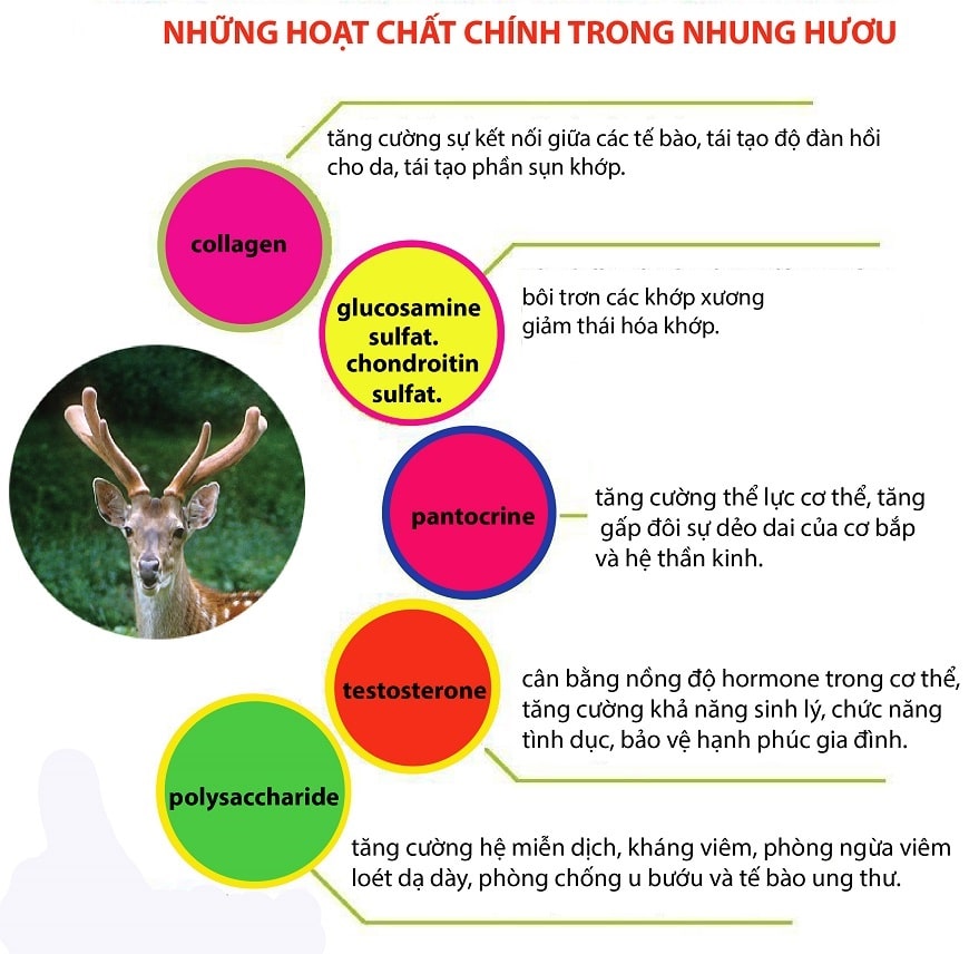 – Với làn da của phụ nữ: trong nhung hươu tươi có chứa hàm lượng lớn collagen giúp làm giảm quá trình lão hóa da, giúp cho làn da trẻ lâu hơn.